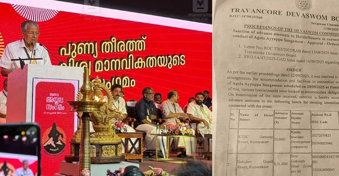 സ്പോൺസർമാർ ആണ് സംഗമത്തിനു പണം നൽകിയതെന്ന വാദമാണ് ഇതോടെ പൊളിയുന്നത്. പമ്പയിൽ നടന്ന അയ്യപ്പ സംഗമത്തിൽ പങ്കെടുക്കാൻ എത്തിയ പ്രതിനിധികളെ താമസിപ്പിക്കുന്നതിനായി തിരഞ്ഞെടുത്തത് കുമരകത്തെ ഹോട്ടലുകളും റിസോർട്ടുകളുമാണ്. താമസസൗകര്യത്തിനായി ലക്ഷങ്ങളാണ് മുൻകൂറായി ദേവസ്വം ഫണ്ടിൽ നിന്ന് നൽകിയത്. 25000 രൂപ, 8,31,600 രൂപ, 3,39,840 രൂപ, 80,000 രൂപ എന്നിങ്ങനെയാണ് വിവിധ ഹോട്ടലുകൾക്ക് മുൻകൂറായി നൽകിയിരിക്കുന്ന തുക.