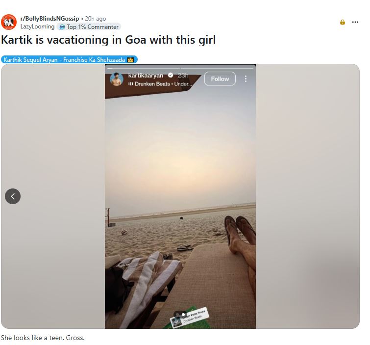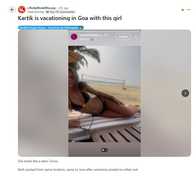 दरअसल, कार्तिक आर्यन ने हाल ही में गोवा में हॉलीडेज मनाते हुए कई तस्वीर शेयर अपनी इंस्टा स्टोरी पर पोस्ट की थी, जिसमें वह बीच के सामने बैड पर रिलैक्स करते हुए नजर आ रहे हैं और सनसेट का आनंद ले रहे हैं। उनकी इस तस्वीर के कुछ समय बाद ही रेडिट ने अपने सोशल मीडिया पर एक महिला की फोटो डाली, जिसने सेम बीच की फोटोज शेयर की थी।