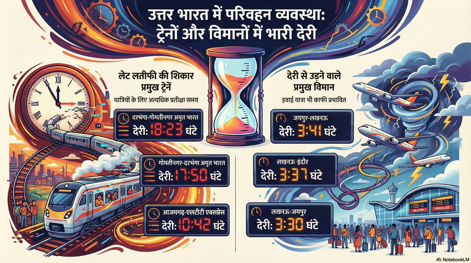 | ट्रेन नंबर व नाम | देरी | | 12556 गोरखधाम एक्सप्रेस | 3:10 घंटा | | 12430 एसी एक्सप्रेस | 1:45 घंटा | | 12232 चंडीगढ़-लखनऊ सुपरफास्ट | 1:09 घंटा | | 13006 अमृतसर-हावड़ा पंजाब मेल | 2:00 घंटा | | 04652 अमृतसर-जयनगर स्पेशल | 3:40 घंटा | | 20104 आजमगढ़-एलटीटी एक्सप्रेस | 10:42 घंटा | | 15562 गोमतीनगर-दरभंगा अमृत भारत | 17:50 घंटा | | 15561 दरभंगा-गोमतीनगर अमृत भारत | 18:23 घंटा |