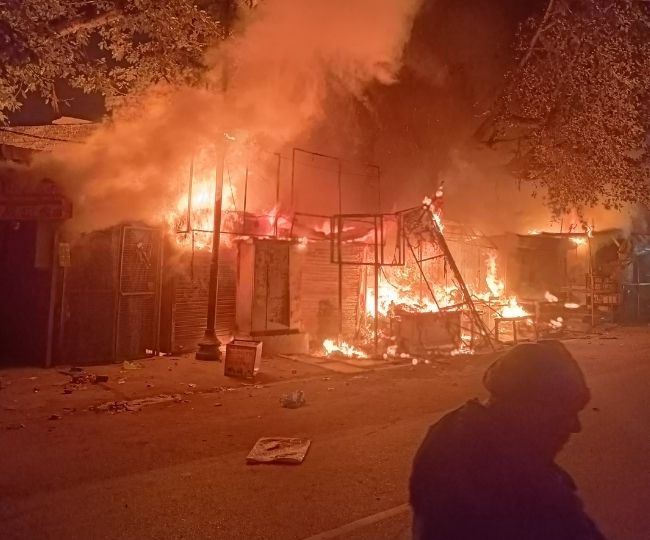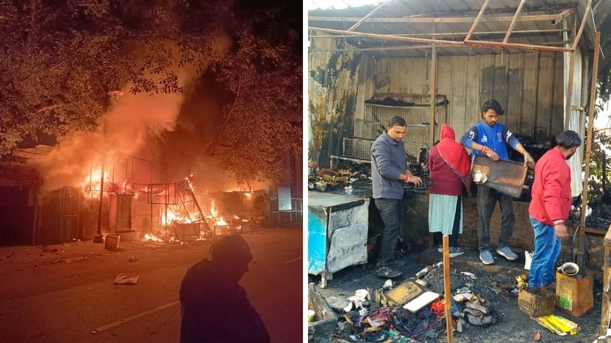 आधी रात को खोखों में लगी भीषण आग। वहीं, अग्निकांड में कुछ सामान सही बचने की उम्मीद में तलाश करते पीड़ित दुकानदार।