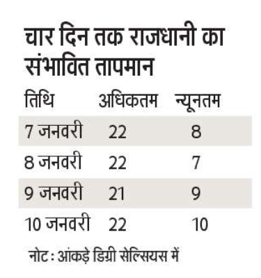 इसके बाद अगले दो दिनों यानी 10 और 11 जनवरी को न्यूनतम तापमान में 2 से 3 डिग्री सेल्सियस की वृद्धि हो सकती है। जिसके बाद ठंड से थोड़ी राहत मिलने की संभावना है। मौसम विभाग ने शीतलहर की स्थिति बरकरार रहने का अनुमान लगाया है। सुबह व शाम में कोहरा छाया रहेगा।
