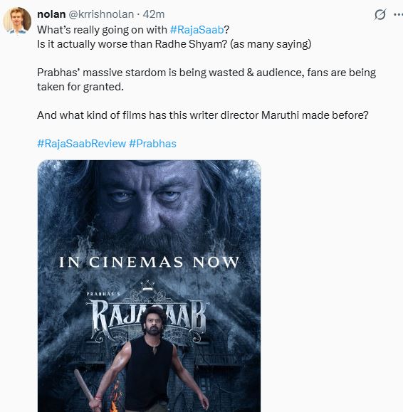 एक यूजर ने लिखा, “प्रभास राजामौली के बिना ऐसा लगता है, जैसे फोन के बिना बैटरी हो..एकदम डेड। राजा साब में उन्होंने जो ओवरएक्टिंग की है, वह सिनेमा में क्राइम है।“