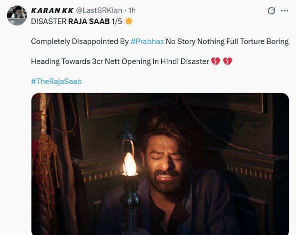 एक अन्य यूजर ने लिखा, “राजा साब के लिए सिर्फ 1.5 स्टार, प्रभास से बहुत ज्यादा निराशा हूं, फिल्म में कोई कहानी नहीं है। टॉर्चर और बोरिंग है। हिंदी में ये फिल्म ओपनिंग डे पर 3 करोड़ से ज्यादा नहीं कमा पाएगी।“
