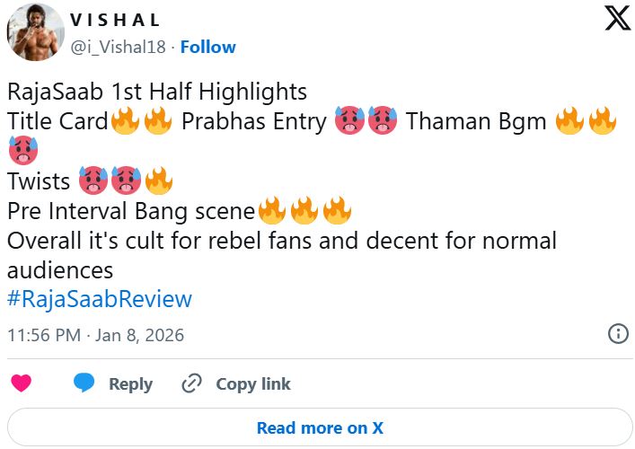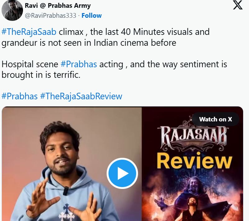 दूसरे यूजर ने लिखा, “राजा साब का क्लाइमेक्स बहुत ही शानदार है। लास्ट के 40 मिनट के विजुअल्स और भव्यता भारतीय सिनेमा में कभी नहीं दिखाई गई है। प्रभास ने अस्पताल सीन में बहुत च्चे हैं, जिस तरह से उनके सीन को परोसा गया है, वह बहुत ही शानदार है।“