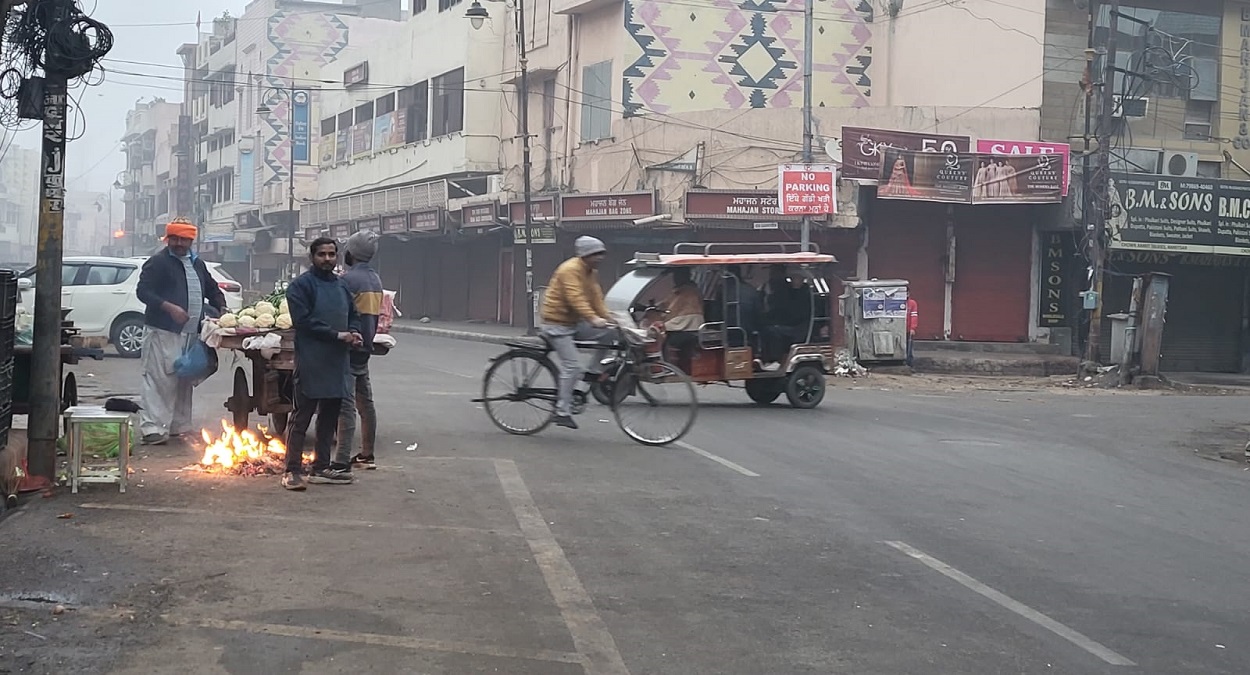 अमृतसर में सुबह के समय ठंड के बीच आगे सेकते लोग।