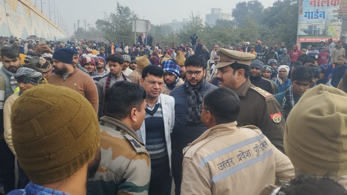 टूंडला में जाम लगाते अग्निवीर के स्वजन को समझाते पुलिस अधिकारी।
