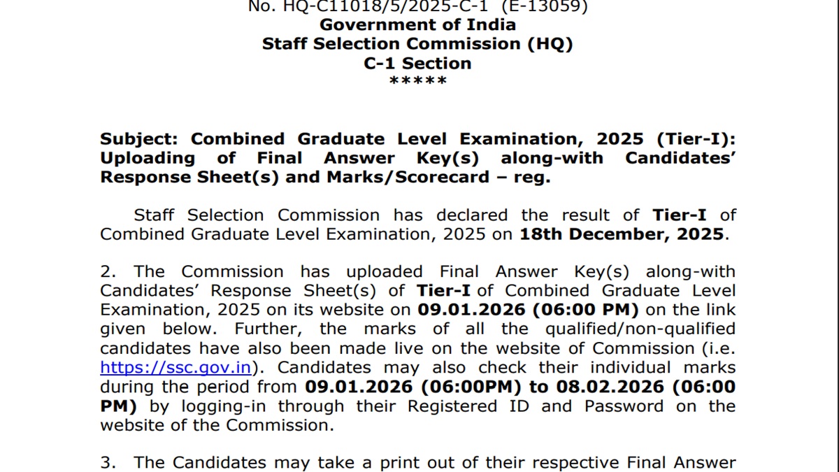 एसएससी की ओर से जारी आधिकारिक अधिसूचना के मुताबिक टियर-1 की परीक्षा में शामिल उम्मीदवार 8 फरवरी 2026 शाम 6 बजे तक फाइनल-आंसर-की और रिस्पॉन्स शीट डाउनलोड कर सकते हैं। इसके बाद एसएससी की ओर से यह सुविधा बंद कर दी जाएगी। ऐसे में सभी उम्मीदवारों को सलाह दी जाती है कि वे तय समय से पहले फाइनल-आंसर-की और रिस्पॉन्स शीट अवश्य डाउनलोड कर लें।