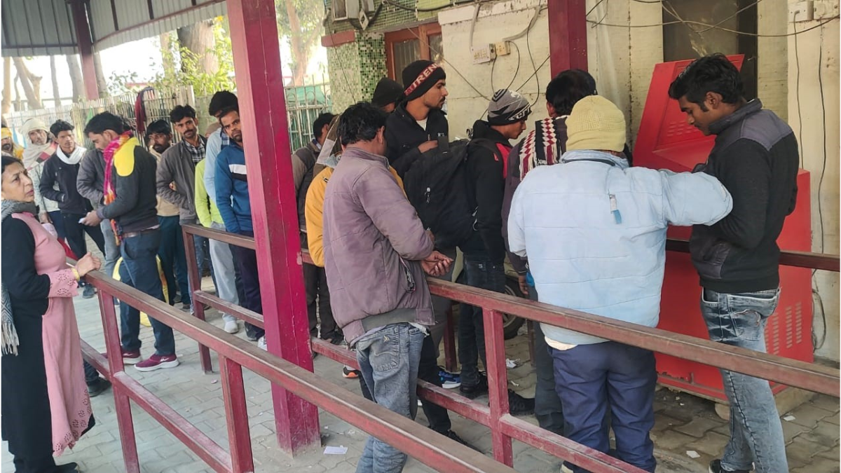 रेलवे स्टेशन पर अस्थायी टिकट घर के बार लगी यात्रियों की लाइन। जागरण