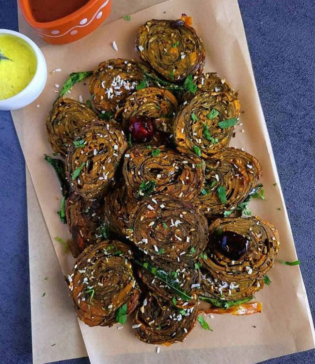 अरबी के पत्तों से बना यह व्यंजन स्वाद और सेहत का अनोखा मिश्रण है। पत्तों पर बेसन का पेस्ट लगाकर, उन्हें रोल कर, भाप में पकाया जाता है और फिर राई-तिल का तड़का लगाया जाता है। यह खट्टा-मीठा और थोड़ा तीखा स्वाद देता है।