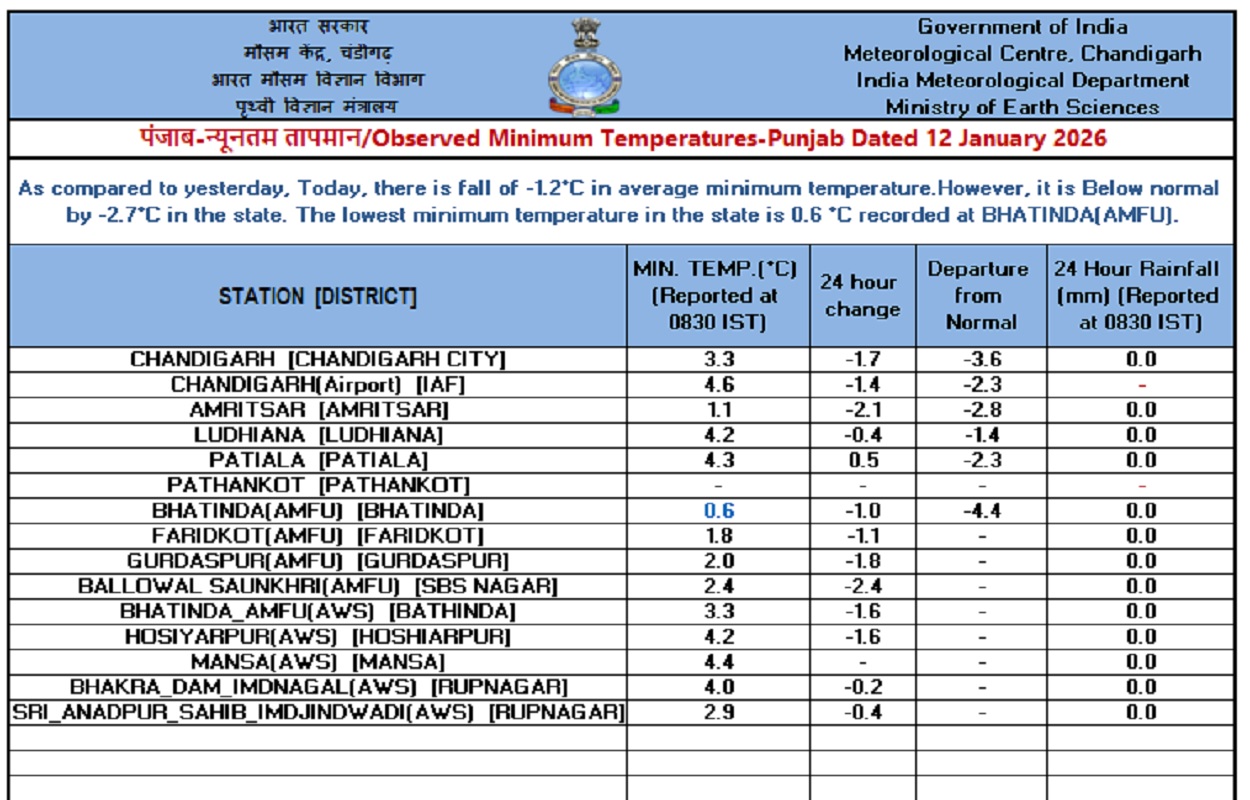 वहीं, अमृतसर का न्यूनतम तापमान 1.1 डिग्री, लुधियाना का 4.2 डिग्री, पटियाला का 4.3 डिग्री, फरीदकोट का 1.8 डिग्री, गुरदासपुर का 2 डिग्री, एसबीएस नगर में 2.4 डिग्री, होशियारपुर में 4.2 उिगी, मानसा में 4.4 डिग्री और रूपनगर में 2.9 डिग्री न्यूनतम तापमान दर्ज किया गया है।