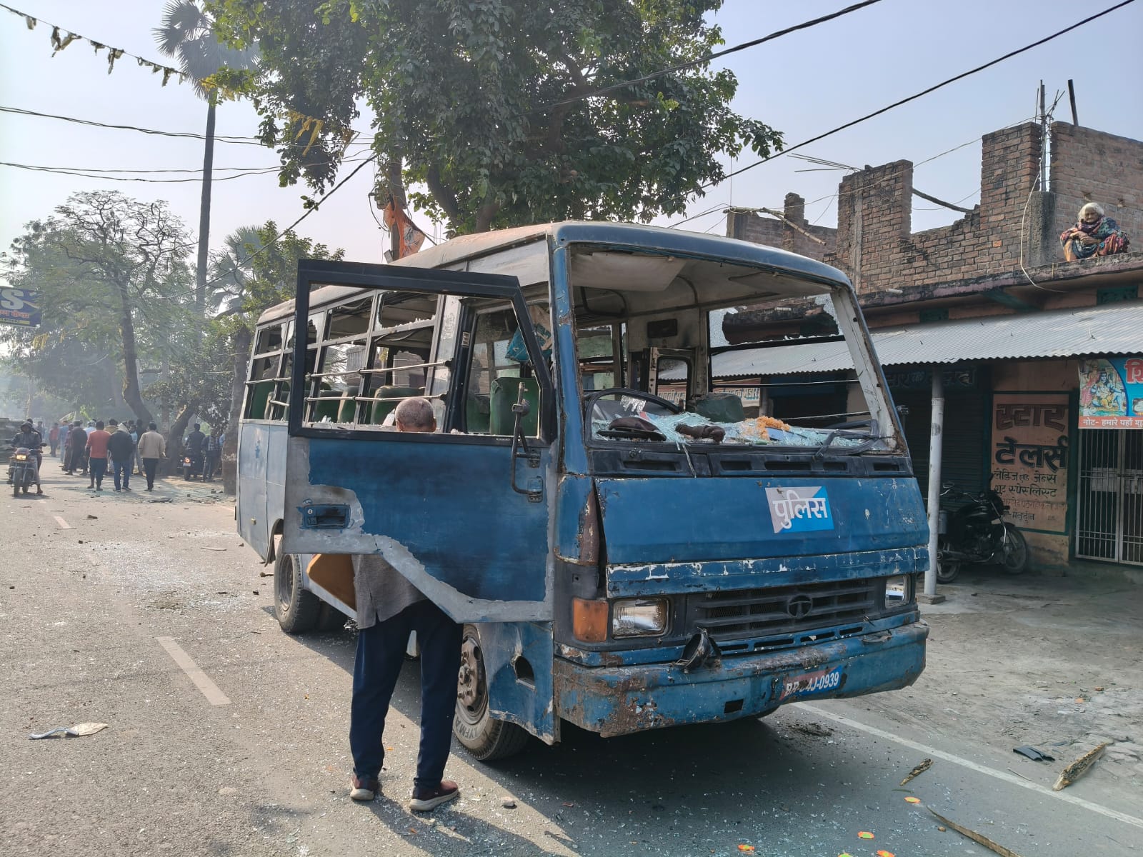 इसी दौरान उपद्रवियों ने पुलिस के दो बोलेरो वाहनों और एक बस को क्षतिग्रस्त कर दिया। दोनों बोलेरो को सड़क और पास के खेत में धकेलकर पलट दिया गया, जबकि बस में भी तोड़फोड़ की गई।