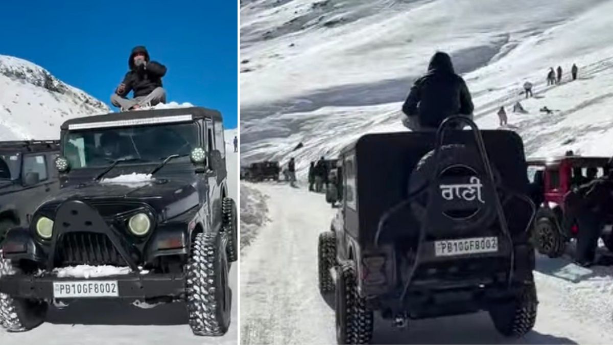 लाहुल में बफीर्ली सड़क पर पंजाब नंबर की गाड़ी में छत पर बैठकर सफर करता पर्यटक।