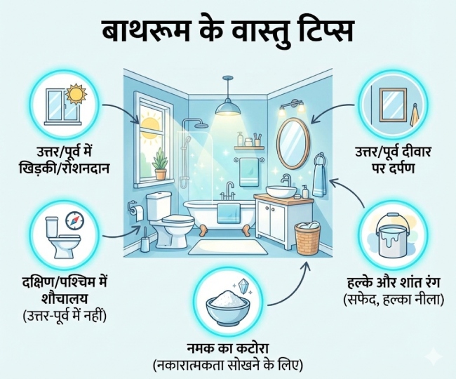 वास्तु शास्त्र में माना गया है कि बाथरूम को हमेशा घर की पश्चिम या उत्तर-पश्चिम दिशा में बनवाना चाहिए। इसे दक्षिण, दक्षिण-पूर्व या ईशान कोण (उत्तर-पूर्व) में बनाने से बचें। अगर आपका बाथरूम किचन के ठीक सामने है, तो यह वास्तु दोष की वजह बन सकता है।