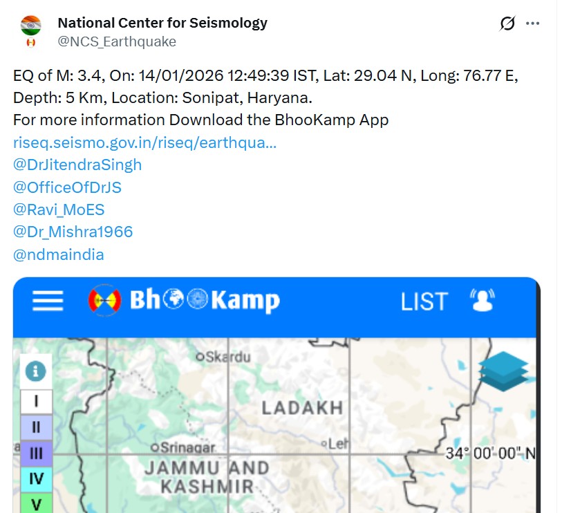 डिजिटल डेस्क, सोनीपत। बुधवार दोपहर हरियाणा के सोनीपत में हल्के भूकंप के झटके महसूस किए गए। नेशनल सेंटर फॉर सिस्मोलॉजी (NCS) के अनुसार, भूकंप की तीव्रता रिक्टर स्केल पर 3.4 मापी गई। इसका केंद्र सतह से सिर्फ 5 किलोमीटर नीचे था।