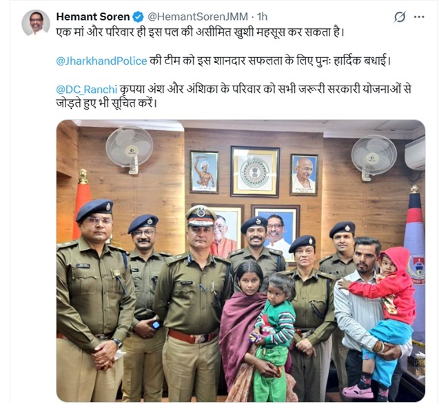 मुख्यमंत्री ने रांची व झारखंड पुलिस को बधाई व अंश तथा अंशिका के परिवार को हार्दिक शुभकामनाएं दी है।