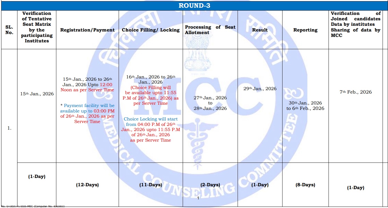 3rd राउंड के लिए काउंसिलिंग शेड्यूल भी जारी