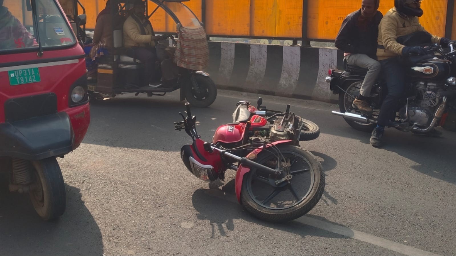 भला यह हुआ उसकी बाइक की रफ्तार तेज नहीं थी फिर भी उसकी गर्दन में गहरा घाव हो गया, बाइक समेत वह ओवरब्रिज पर गिर पड़ा, लोगों ने उसे उठाकर इलाज के लिए भेजा, जहां उसकी हालत अब ठीक है।
