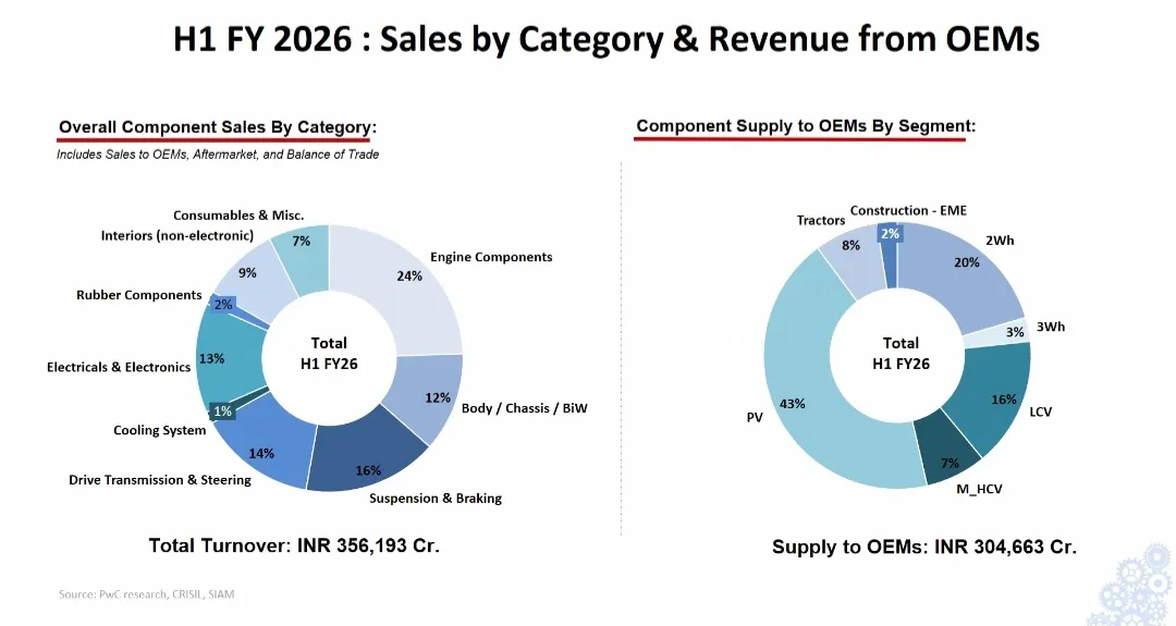 [color=hsl(0,0%,0%)]Electric vehicle components accounted for 4.6 per cent of total supplies to OEMs in H1 FY26, underlining the industry’s gradual but steady shift towards new-age mobility. While EVs are still a small part of the overall market, their rising share reflects growing investments in localisation and technology readiness across the component ecosystem.