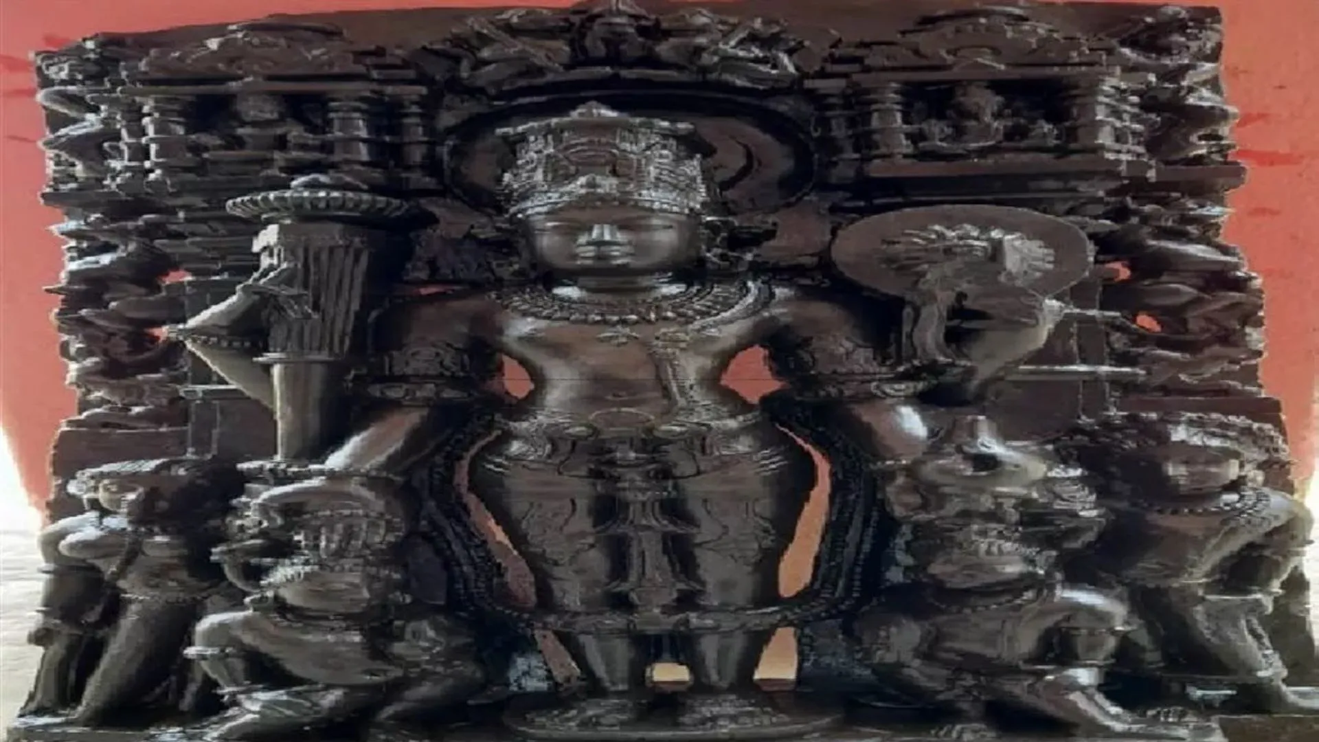 मूर्ति के दोनों ओर हाथी को वश में करते हुए सिंह की नक्काशी है।