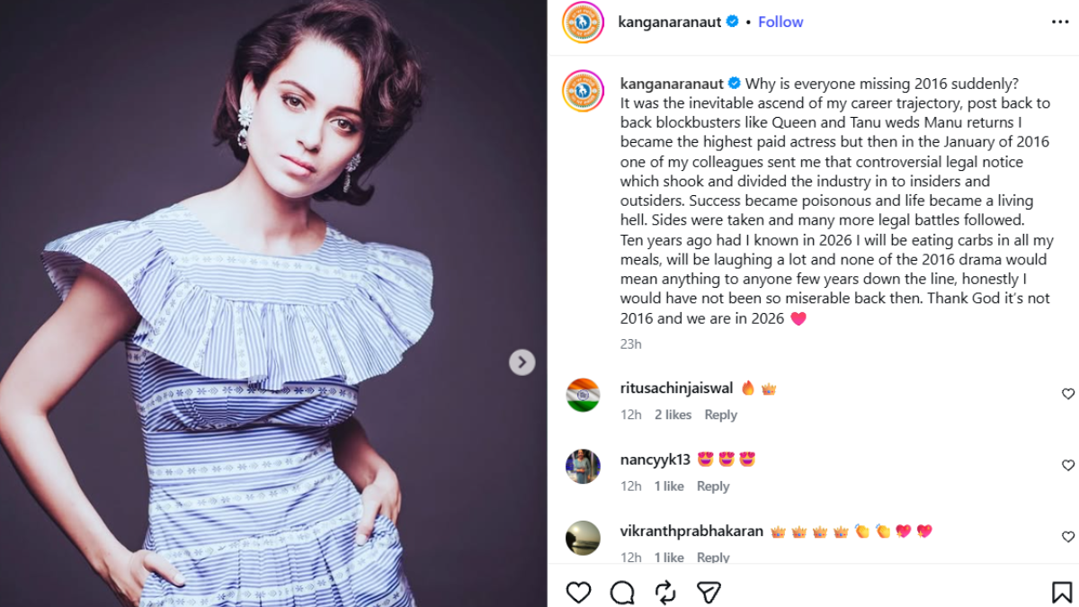एंटरटेनमेंट डेस्क, नई दिल्ली। एक्ट्रेस कंगना रनौत बेबाक तो हैं ही साथ वे हमेशा कुछ हटकर करने के लिए भी जानी जाती हैं। अब हाल ही में वायरल ट्रेंड 2016 (2026 Trend) में उन्होंने ऐसा ही कुछ किया। बॉलीवुड \“क्वीन\“ \“2026 इज द न्यू 2016\“ ट्रेंड में शामिल हो गई हैं। एक्ट्रेस ने 2016 की कुछ पुरानी तस्वीरें एक लंबे नोट के साथ शेयर कीं, और उस समय को भी याद किया जब वह प्रोफेशनल करियर के मामले में टॉप पर थीं, लेकिन मुश्किल दौर से गुजर रही थीं।