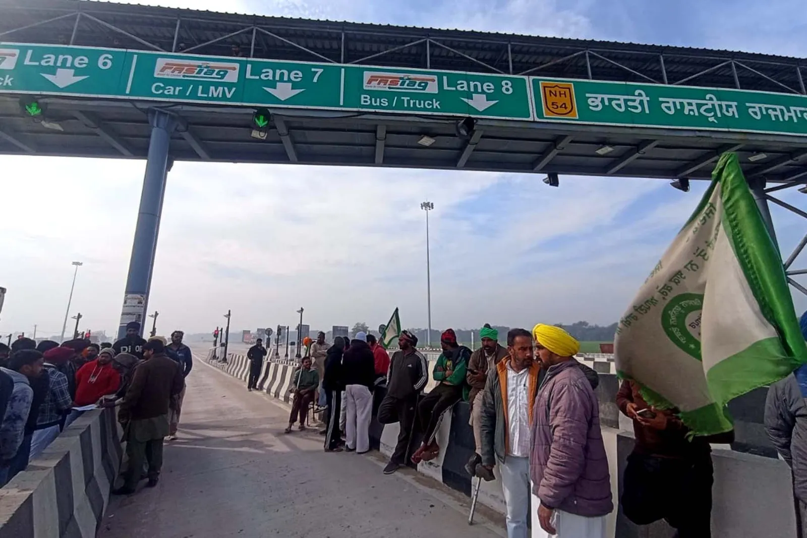 बठिंडा में संगत मंडी में टोल प्लाजा को फ्री करवाते हुए किसान।
