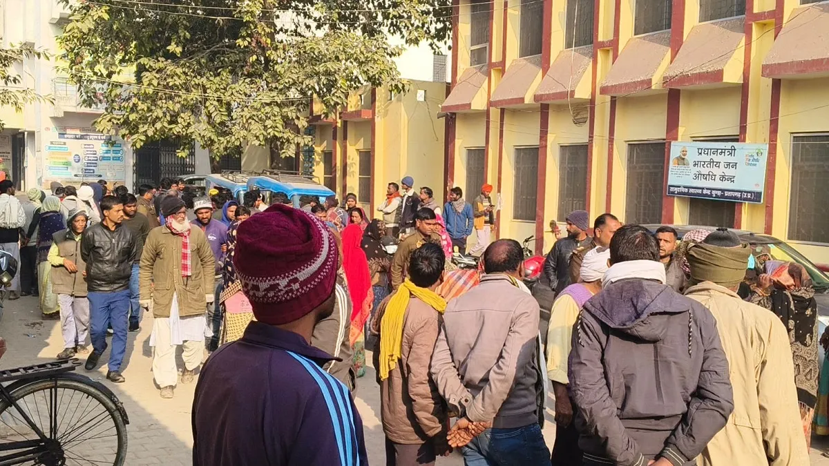 प्रतापगढ़ के कुंडा के एक गांव में विवाहिता की संदिग्ध मौत के बाद जुटी भीड़। जागरण