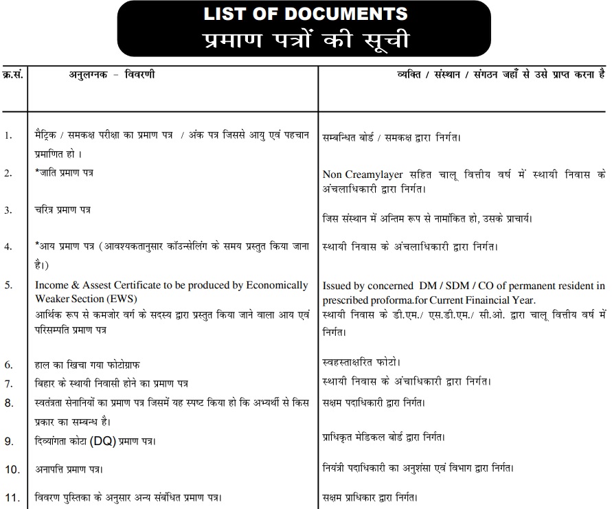 - अधिकतम आयु अनारक्षित (पुरुष) के लिए 37 वर्ष, महिला के लिए 40 वर्ष, पिछड़ा एवं अत्यंत पिछड़ा वर्ग के लिए 40 साल, अनुसूचित जाति एवं अनुसूचित जनजाति के लिए 42 वर्ष से ज्यादा न हो। दिव्यांग उम्मीदवारों को ऊपरी उम्र में 10 वर्ष की छूट दी गई है।