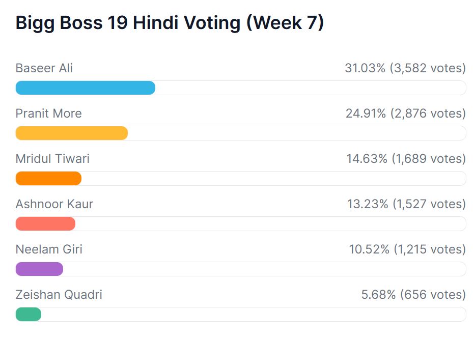 हर हफ्ते जब भी कंटेस्टेंट बिग बॉस हाउस से बेघर होने के लिए नॉमिनेट होते हैं, तो जियो हॉटस्टार स्टार पर वोटिंग पोल खोल दिया जाता है। इस हफ्ते नॉमिनेटेड कंटेस्टेंट में से जिसके गेम को अभी भी ऑडियंस सबसे ज्यादा देखना चाहती है, वह बसीर अली हैं, क्योंकि उन्हें इस हफ्ते खतरे से बचाने के लिए 31.3% वोट्स मिले हैं।