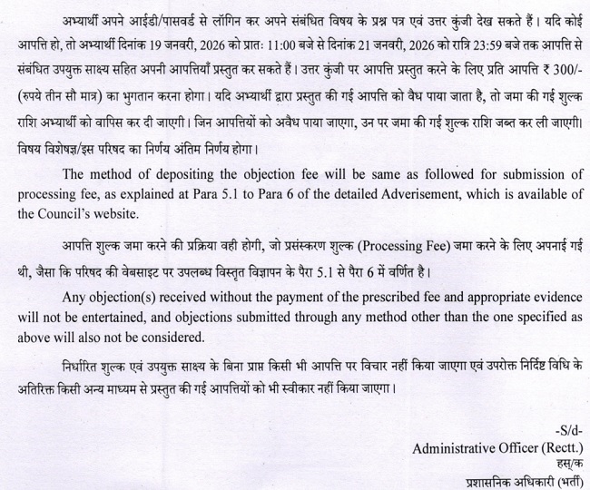 अगर कोई अभ्यर्थी आंसर की में दिए किसी उत्तर से संतुष्ट नहीं है तो वे उस पर आपत्ति दर्ज कर सकते हैं। सीसीआरएएस की ओर से ऑब्जेक्शन विंडो आज यानी 19 जनवरी से ओपन कर दी है जो 21 जनवरी 2026 तक रात्री 11 बजकर 59 मिनट तक उस पर आपत्ति दर्ज कर सकते हैं। ऑब्जेक्शन दर्ज करने के लिए उम्मीदवारों को 300 रुपये प्रति प्रश्न के हिसाब से भुगतान करना होगा। फीस ऑनलाइन माध्यम से जमा की जा सकती है।
