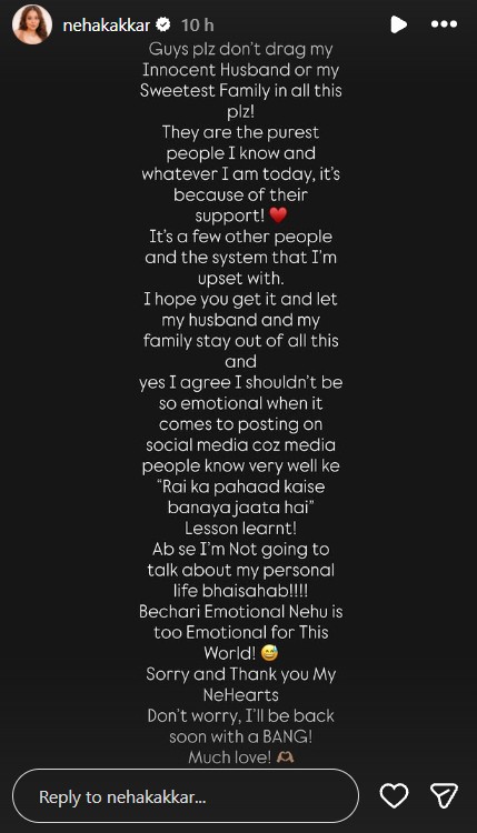 बाद में सोमवार को नेहा ने अपनी इंस्टाग्राम स्टोरीज पर एक डिटेल में सफाई दी, जिसमें उन्होंने इन अटकलों और उनकी शादी के बारे में बन रही बातों पर बात की। नेहा ने लिखा, \“दोस्तों, प्लीज मेरे मासूम पति या मेरे प्यारे परिवार को इस सब में मत घसीटो! वे सबसे अच्छे लोग हैं जिन्हें मैं जानती हूं और आज मैं जो कुछ भी हू, उनकी वजह से ही हूं। मैं कुछ दूसरे लोगों और सिस्टम से नाराज हूं। मुझे उम्मीद है कि आप यह समझेंगे और मेरे पति और मेरे परिवार को इन सब से दूर रखेंगे और हां, मैं मानती हूं कि सोशल मीडिया पर पोस्ट करते समय मुझे इतना इमोशनल नहीं होना चाहिए, क्योंकि मीडिया वाले बहुत अच्छे से जानते हैं कि राई का पहाड़ कैसे बनाया जाता है। सबक सीख लिया\“।