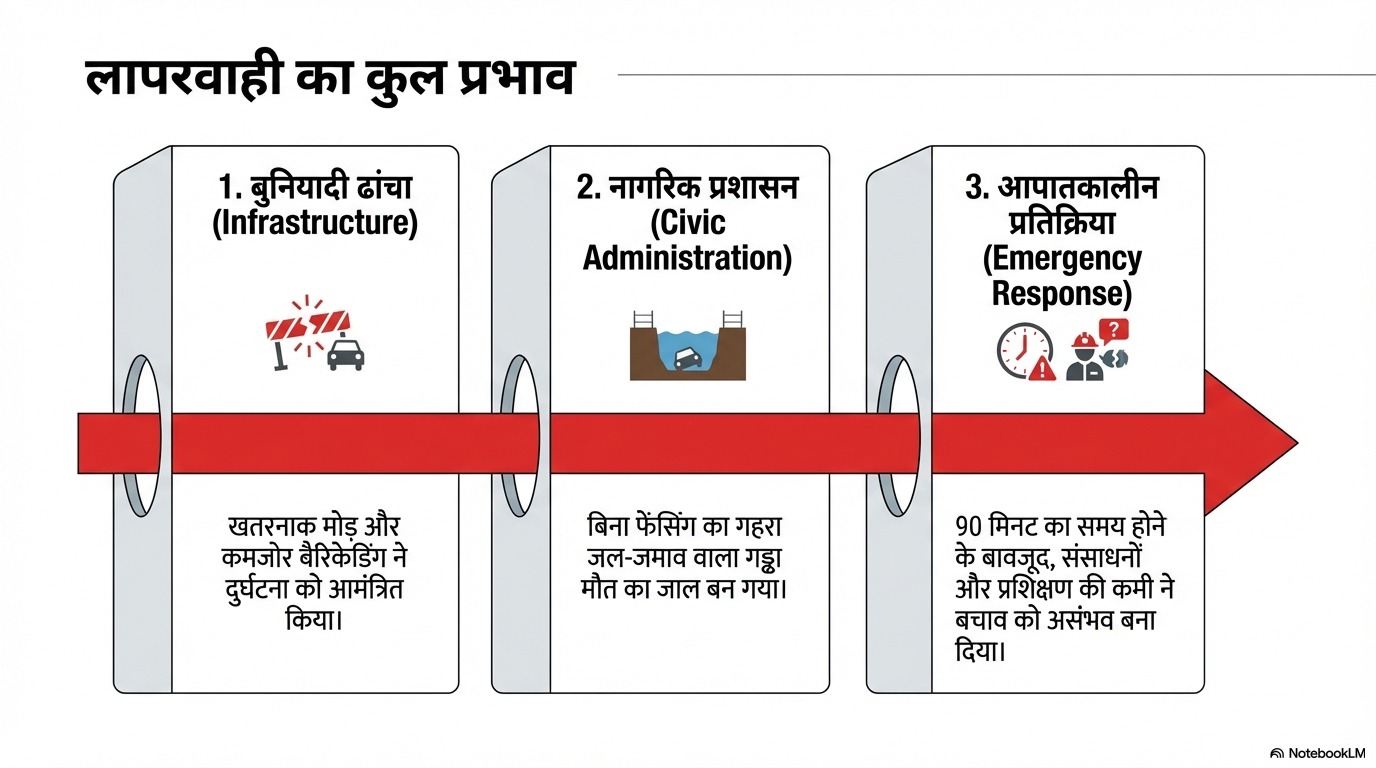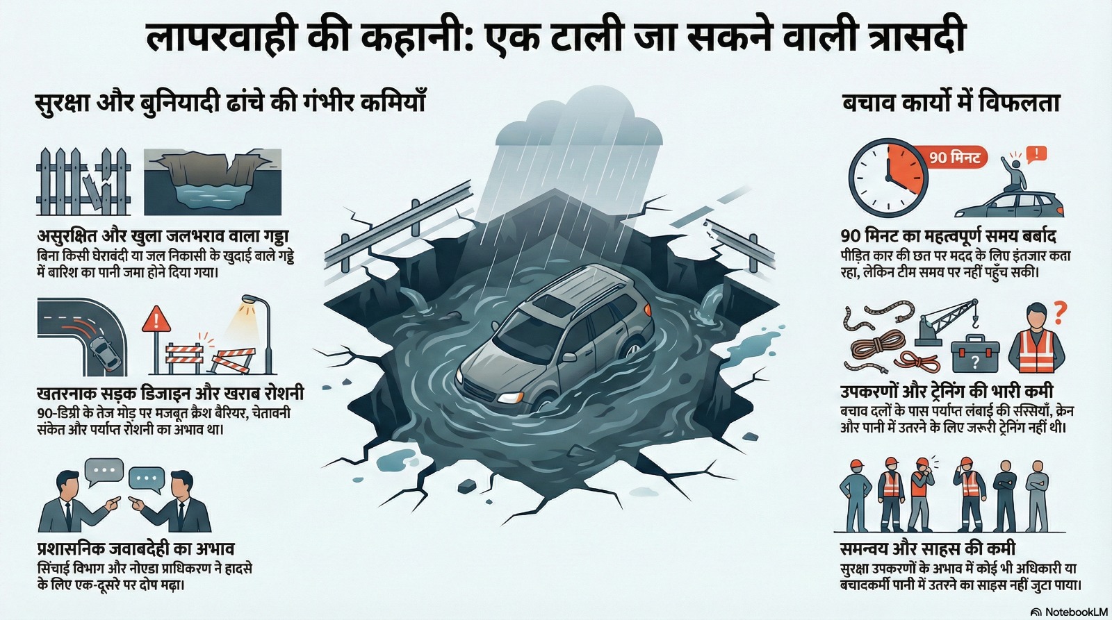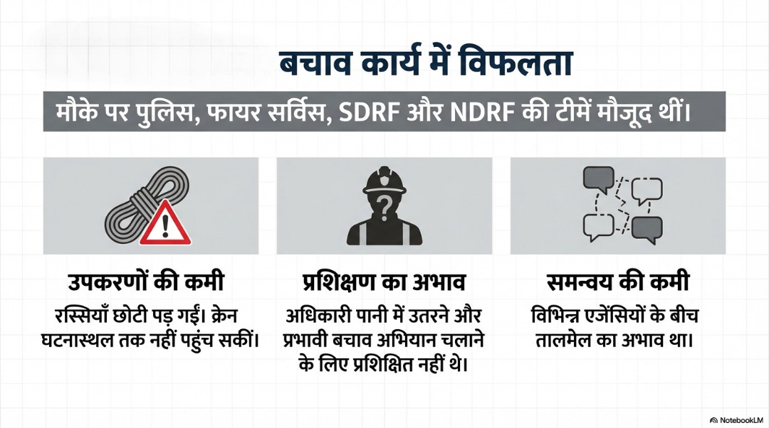 करीब 90 मिनट का रेस्क्यू विंडो होने के बावजूद पुलिस, फायर सर्विस, SDRF और NDRF युवराज को बचा नहीं सकीं। उनके पास  जरूरी उपकरण, ट्रेनिंग और आपसी समन्वय तक नहीं था। रस्सियां छोटी थीं, क्रेन नहीं पहुंच सकी और अधिकारी पानी में उतरकर रेस्क्यू करने के लिए प्रशिक्षित नहीं थे। रेस्क्यू में हुई यह देरी जानलेवा साबित हुई।