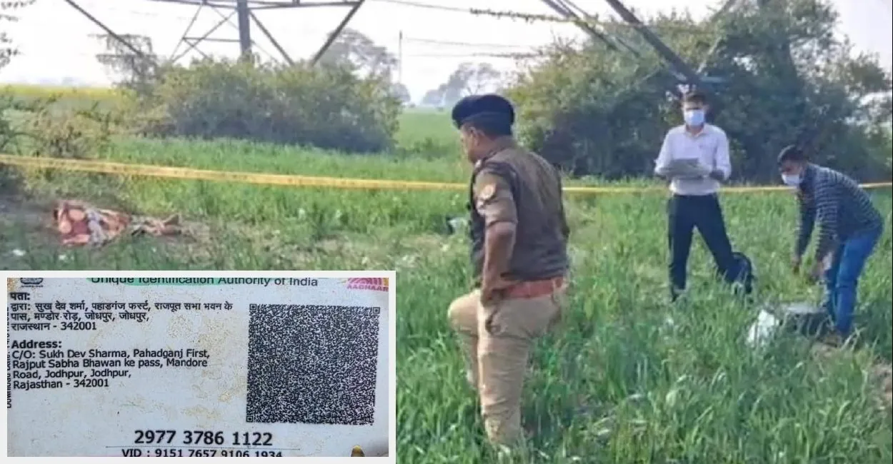 महिला का शव मिलने के बाद घटनास्थल पर जांच करते पुलिस अधीक्षक व फोरेंसिक टीम के सदस्य। जागरण (इनसेट में- घटनास्थल के पास से बरामद आधार कार्ड।)