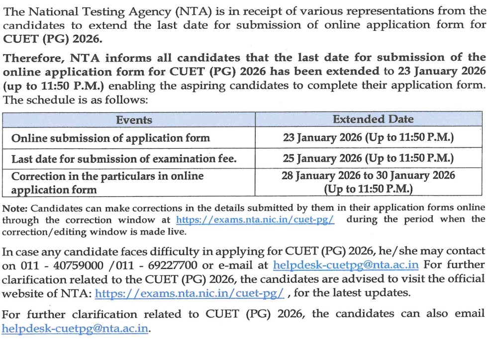 एप्लीकेशन प्रॉसेस पूरी होने के बाद जिन छात्रों से आवेदन करते समय गलती हो जाएगी उनको इसमें संशोधन करने के लिए एक मौका दिया गया है। एनटीए की ओर से करेक्शन विंडो 28 से 30 जनवरी 2026 तक ओपन की जाएगी। अभ्यर्थी इन्हीं डेट्स के अंदर फॉर्म में सुधार कर पाएंगे
