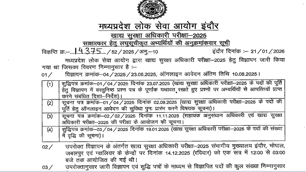 एजुकेशन डेस्क, नई दिल्ली। मध्य प्रदेश लोक सेवा आयोग (MPPSC) की ओर से फूड सेफ्टी ऑफिसर भर्ती परीक्षा का रिजल्ट जारी कर दिया गया है। जो उम्मीदवार MPPSC FSO 2025 की परीक्षा में शामिल हुए थे और बेसब्री से रिजल्ट का इंतजार कर रहे थे। अब वे एमपीपीएससी की ऑफिशियल वेबसाइट mppsc.mp.gov.in पर जाकर अपना रिजल्ट देख व डाउनलोड कर सकते हैं। एमपीपीएससी की ओर से रिजल्ट पीडीएफ फॉर्मेट में डाउनलोड किया गया है।