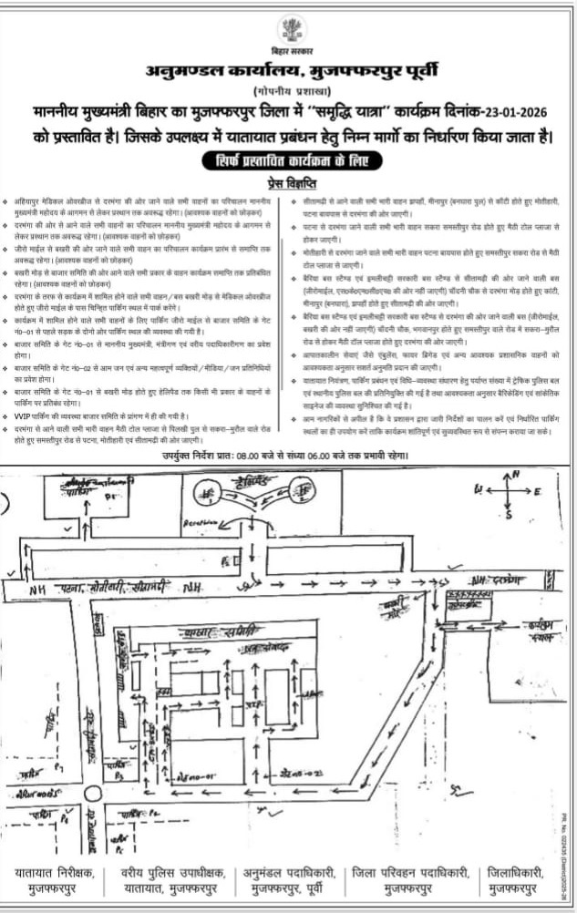 प्रशासन ने लोगों से अपील की है कि अनावश्यक यात्रा से बचें और वैकल्पिक मार्गों का उपयोग करें, ताकि मुख्यमंत्री के कार्यक्रम के दौरान यातायात और सुरक्षा व्यवस्था सुचारू रूप से बनी रहे।