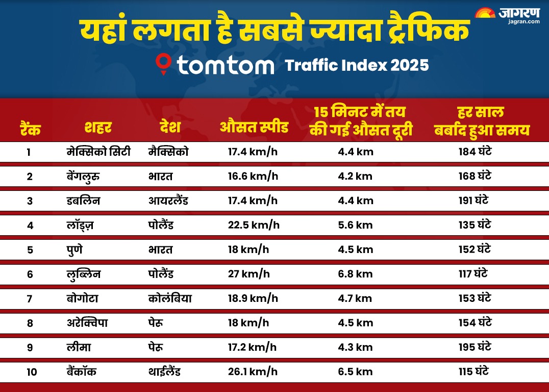 ऑटो डेस्क, नई दिल्‍ली। शहरों में बढ़ती गाड़ियों की संख्या और सीमित रोड इंफ्रास्ट्रक्चर की वजह से ट्रैफिक अब सिर्फ “देरी” नहीं, बल्कि एक रोज़ की परेशानी बन चुका है। TomTom Traffic Index की लेटेस्ट रैंकिंग में ऐसे शहरों की लिस्ट सामने आई है, जहां औसत भीड़भाड़ सबसे ज्यादा है। इस रिपोर्ट में सिर्फ ट्रैफिक का प्रतिशत ही नहीं, बल्कि गाड़ियों की औसत स्पीड, 15 मिनट में तय की गई औसत दूरी और सालभर में पीक आवर्स के दौरान बर्बाद हुआ समय भी बताया गया है। आइए विस्तार जानते हैं दुनिया उन टॉप-10 शहरों के बारे में जहां पर सबसे ज्यादा ट्रैफिक लगता है।
