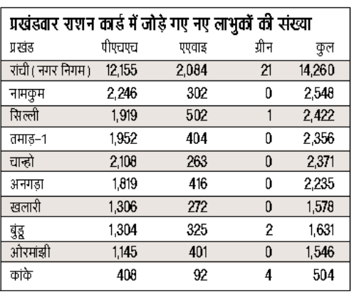 इस अवधि में पीएचएच के 32,739, एएवाइ के 6,568 और ग्रीन राशन कार्ड के 39 नए लाभुक जुड़े। शहरी क्षेत्र में रांची नगर निगम सबसे आगे रहा, जहां अकेले 14,260 लाभुकों के नाम जोड़े गए। नामकुम (2,548), चान्हो (2,371), तमाड़ (2,356), सिल्ली (2,422) और अनगड़ा (2,235) में भी बड़ी संख्या में नए नाम जुड़े हैं।