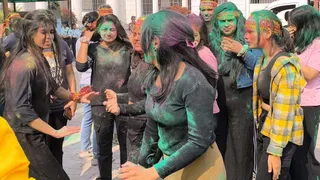भागलपुर में सरस्वती पूजा के विसर्जन के दौरान अबीर-गुलाल लगाकर नृत्य करतीं युवतियां