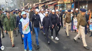 मानव श्रृंखला के दौरान सड़क पर पदयात्रा करते धनबाद के उपायुक्त आदित्य रंजन, एसएसपी प्रभात कुमार और अन्य।