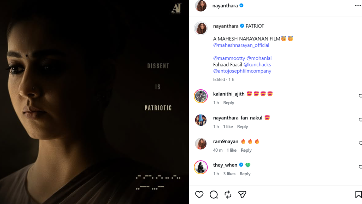 पोस्टर में \“विरोध करना देशभक्ति है\“ लिखा हुआ है, जो फिल्म के आज के सामाजिक-राजनीतिक मुद्दों से जुड़े होने का संकेत देता है। नयनतारा के लुक का खुलासा पिछले साल 2 अक्टूबर को पैट्रियट टीजर रिलीज होने के कुछ समय बाद हुआ है। इस फिल्म को महेश नारायणन ने डायरेक्ट किया है, जो मलयालम सिनेमा में अपने काम के लिए जाने जाते हैं। इसमें मोहनलाल, ममूटी, फहद फासिल, कुंचाको बोबन, दर्शना राजेंद्रन और रेवती जैसे कई कलाकार शामिल हैं। इतने बड़े कलाकारों के एक साथ आने से फिल्म की कहानी और थीम की गहराई को लेकर उम्मीदें बढ़ गई हैं।