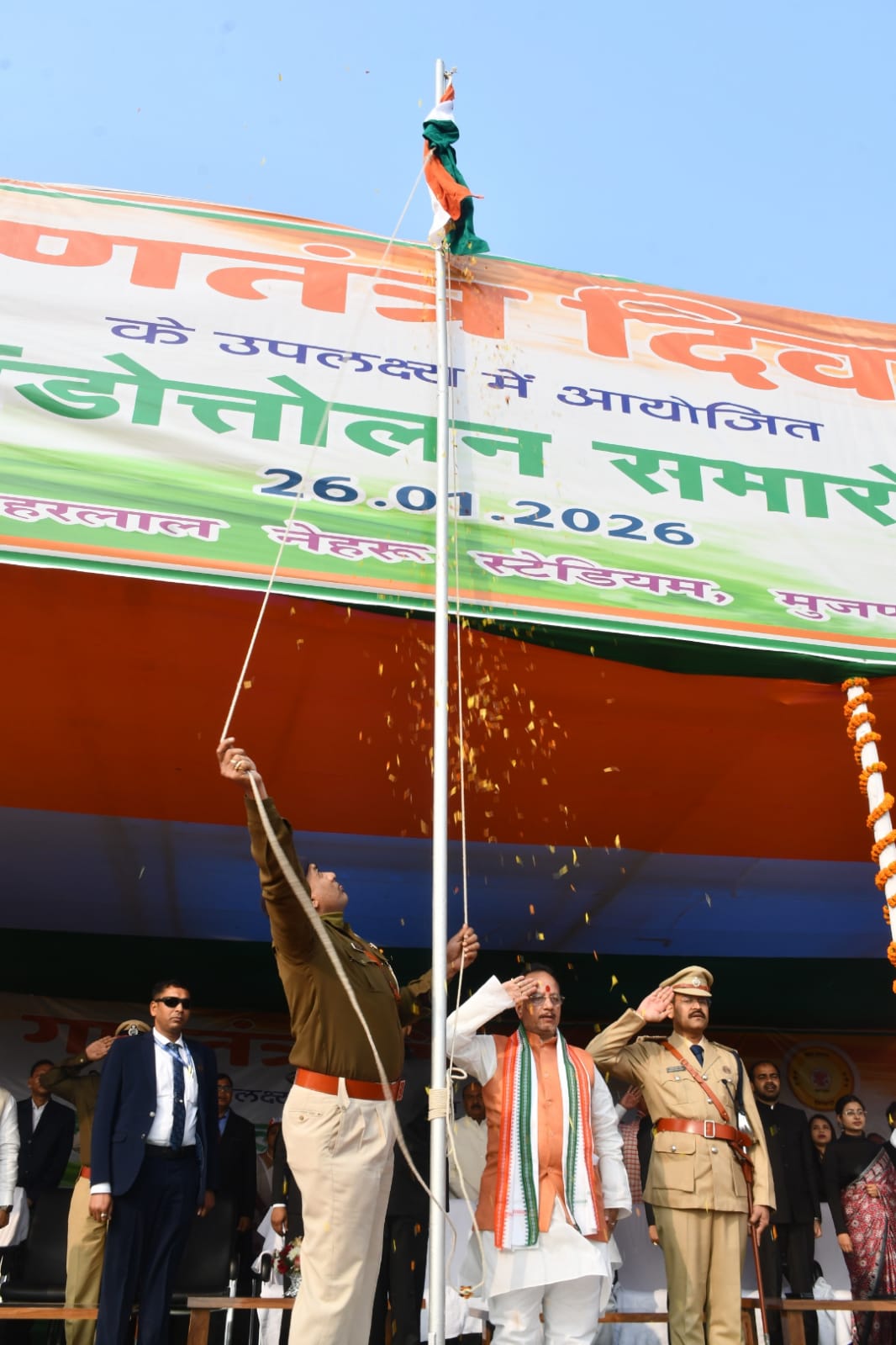 जागरण संवाददाता, मुजफ्फरपुर। Republic Day Muzaffarpur: गणतंत्र दिवस के अवसर पर सिकंदरपुर स्थित पंडित नेहरू स्टेडियम में आयोजित मुख्य समारोह में उप मुख्यमंत्री सह प्रभारी मंत्री विजय सिन्हा ने झंडोत्तोलन किया। इस दौरान उन्होंने राज्य में कानून का राज स्थापित करने और सुशासन को और मजबूत बनाने का संकल्प दोहराया।