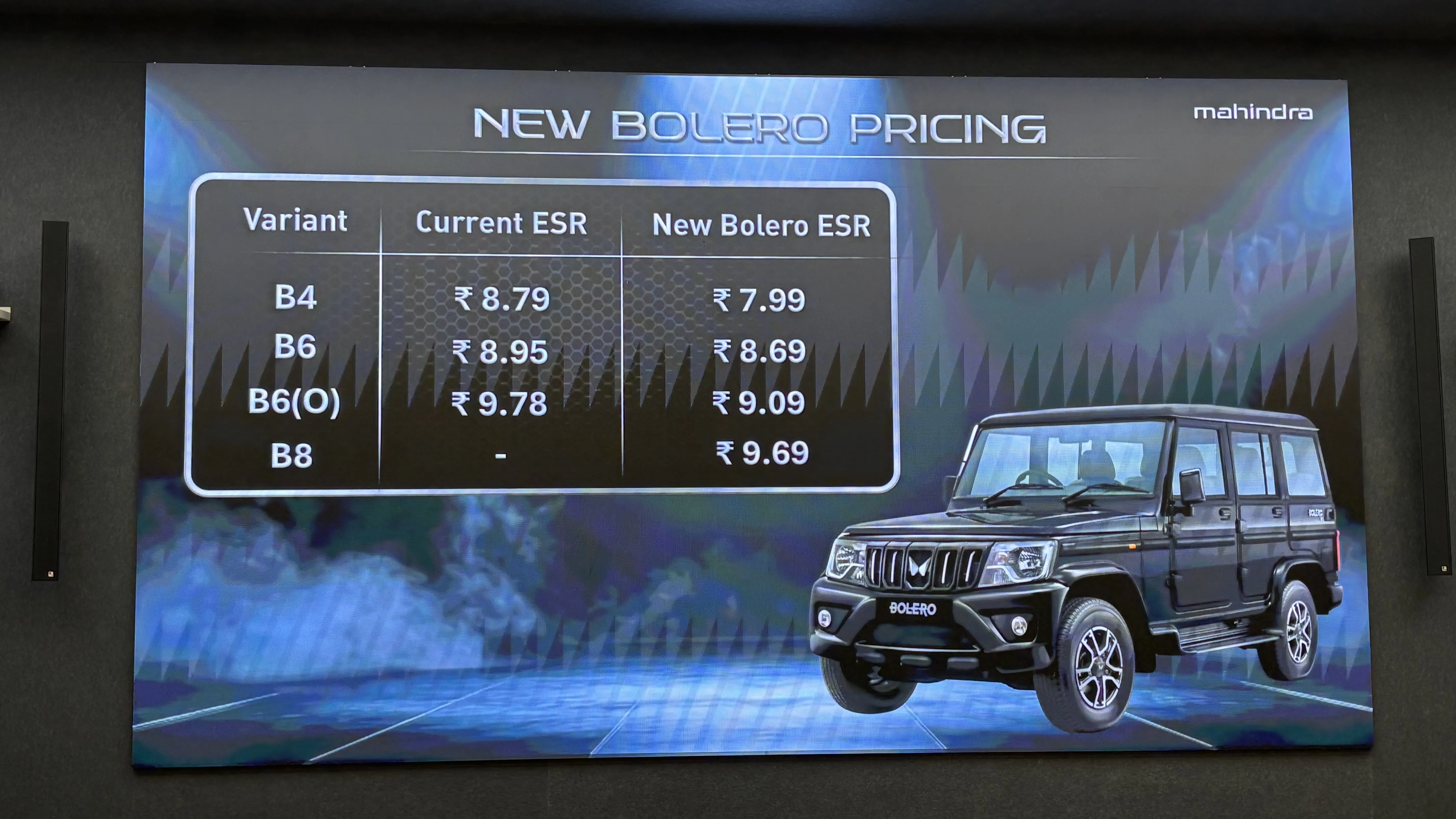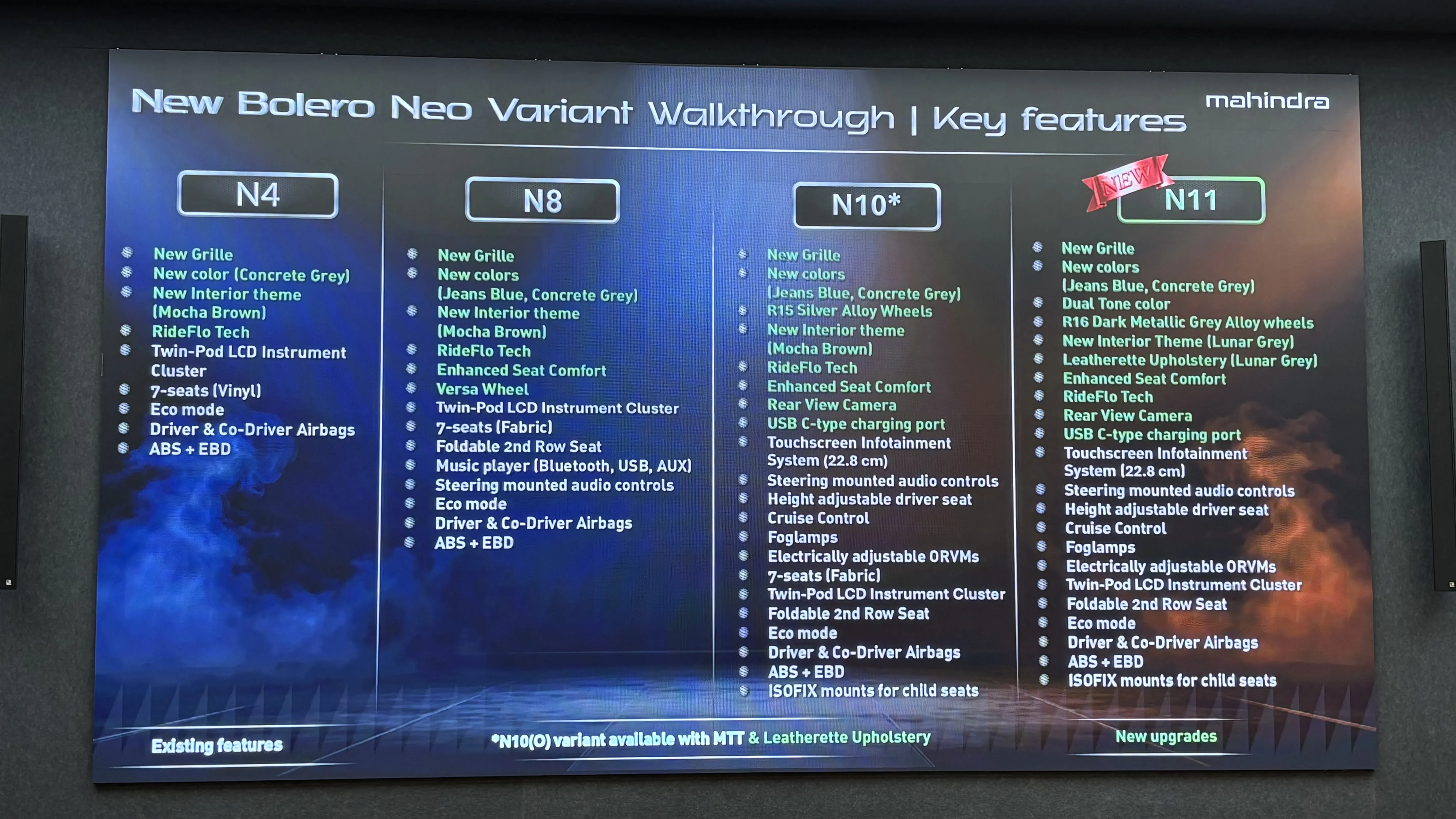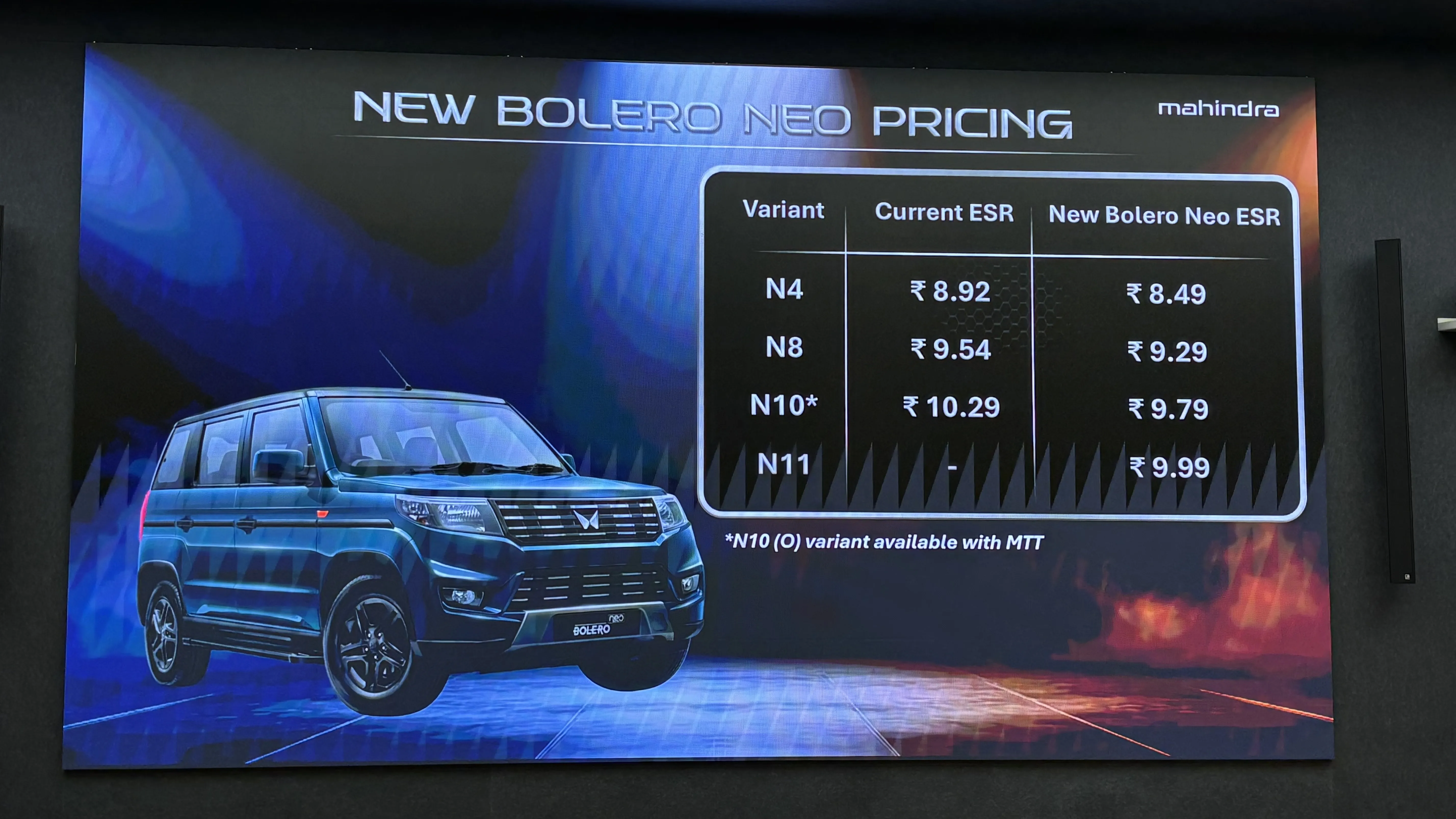 [color=hsl(0,0%,0%)]For the Bolero, the B4 variant starts at Rs 7.99 lakh, the B6 at Rs 8.69 lakh, B6(O) at Rs 9.09 lakh, and the new top-end B8 at Rs 9.69 lakh. The Bolero Neo starts with the N4 variant at Rs 8.49 lakh, followed by N8 at Rs 9.29 lakh, N10* at Rs 9.79 lakh, and the new top-end N11 at Rs 9.99 lakh (*optional variant pricing available at dealerships).