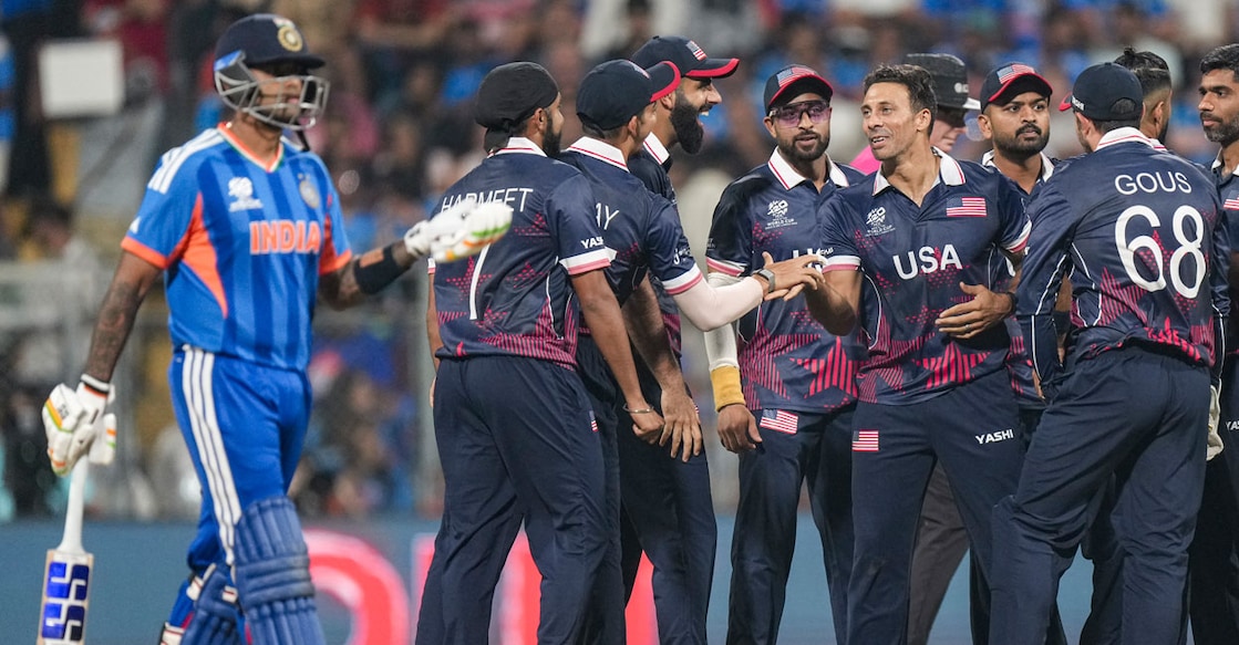 കഴിഞ്ഞ ദിവസം നടന്ന ടി 20 ലോകകപ്പ് ക്രിക്കറ്റ് മത്സരത്തിൽ ഇന്ത്യ 29 റൺസിനാണ് യുഎസ്എയെ പരാജയപ്പെടുത്തിയത്. ആദ്യം ബാറ്റ് ചെയ്ത ഇന്ത്യ 9 വിക്കറ്റ് നഷ്ടത്തിൽ 161 റൺസെടുത്തു. മറുപടി ബാറ്റിങിനിറങ്ങിയ യുഎസ്എ 132 റൺസിന് പുറത്തായി. ഇരു ടീമുകളുടെയും റൺസ് തമ്മിലുള്ള അന്തരം 18 ശതമാനമാണ്. ഇന്ത്യൻ ഉല്പന്നങ്ങൾക്ക് യുഎസ് ചുമത്തിയ 18 ശതമാനം പകരത്തീരുവയും ഈ കണക്കും ബന്ധപ്പെടുത്തിയായിരുന്നു ഗോയലിന്റെ പരാമർശം. ട്വന്റി20 ലോകകപ്പിൽ ഇന്ത്യ–യുഎസ്എ മത്സരത്തിന്റെ ടോസ് സമയത്ത് ക്യാപ്റ്റന്മാരായ സൂര്യകുമാർ യാദവും മോനാങ്ക് പട്ടേലും (X/BCCI)