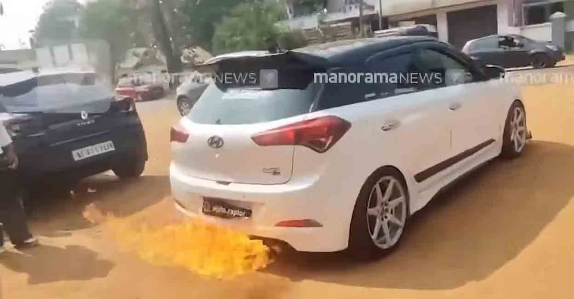 A fire-spitting car was seized in Kollam during an attempt to change its color, leading to the cancellation of its registration and the owner\“s license. The modified vehicle, which emitted fire from its exhaust while accelerating, was found at a painting workshop. |