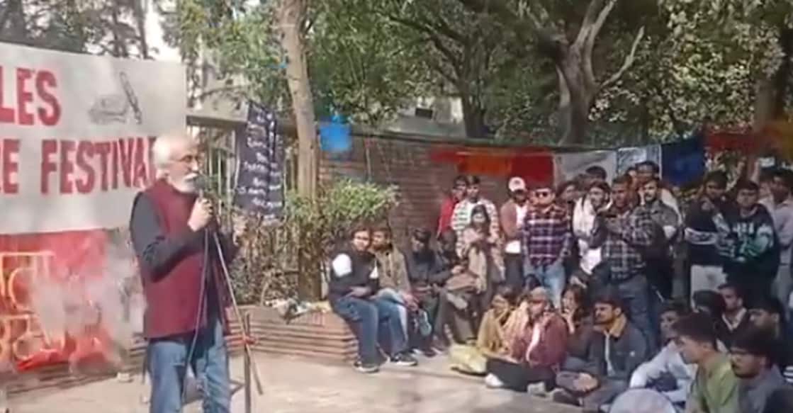 During Samta Diwas at Delhi University’s Arts Faculty, unidentified people throws water and a dustbin at historian Prof. S. Irfan Habib while he was speaking.