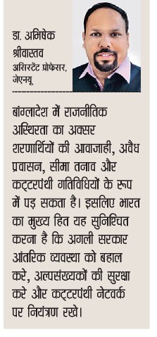 बांग्लादेश से रिश्ते भारत की प्रायोरिटी में क्यों? ढाका की राजनीतिक अस्थिरता अक्सर सीमाओं के भीतर नहीं रहती है, इसलिए भारत की पहली प्राथमिकता बांग्लादेश के भीतर स्थिरता होनी चाहिए क्योंकि इसका असर शरणार्थियों की आवाजाही, अवैध प्रवासन, सीमा तनाव और कट्टरपंथी गतिविधियों के रूप में पड़ सकता है। बंगाल और असम विशेष रूप से संवेदनशील हैं। इसलिए भारत का मुख्य हित यह सुनिश्चित करना है कि अगली सरकार आंतरिक व्यवस्था को बहाल करे, अल्पसंख्यकों की सुरक्षा करे और कट्टरपंथी नेटवर्क पर नियंत्रण रखे। बांग्लादेश में चल रहे आर्थिक संकट तथा सामाजिक असंतोष के बीच भारत के लिए यह स्थिति जिम्मेदारी और अवसर दोनों लेकर आती है। ऊर्जा, व्यापार और आपूर्ति शृंखलाओं के मामले में बांग्लादेश की भारत पर बड़ी निर्भरता है। भारत से बिजली आपूर्ति बांग्लादेश के बिजली तंत्र का महत्वपूर्ण हिस्सा है। ट्रांजिट समझौते भारत के मुख्य भूभाग को पूर्वोत्तर से जोड़ते हैं। यदि इन व्यवस्थाओं में बाधा आती है, तो बांग्लादेश को नुकसान होगा। भारत के नजरिये से आर्थिक सहयोग को राजनीतिक उतार-चढ़ाव से अलग रखना जरूरी है।