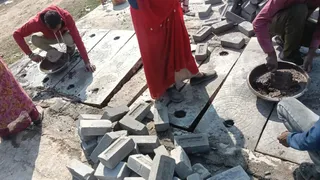 रोेहिणी सेक्टर-32 में खुले नाले पर स्लैब व फुटपाथ पर इंटरलाकिंग टाइल्स लगाते श्रमिक। फोटो: जागरण