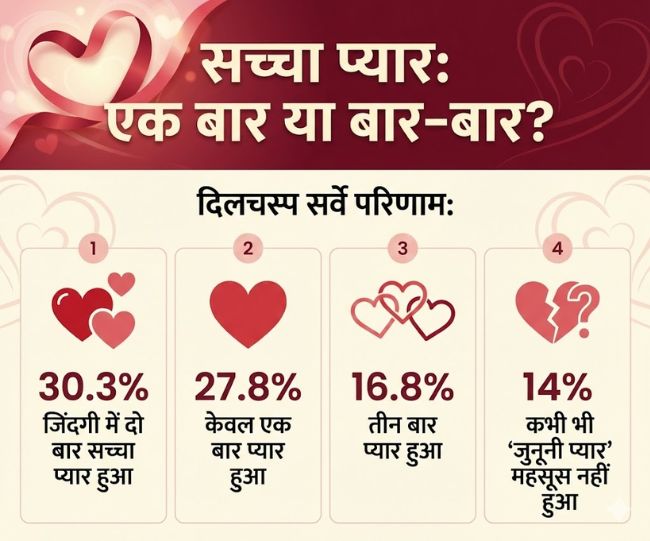 - 30.3% लोगों ने माना कि उन्हें जिंदगी में दो बार सच्चा प्यार हुआ