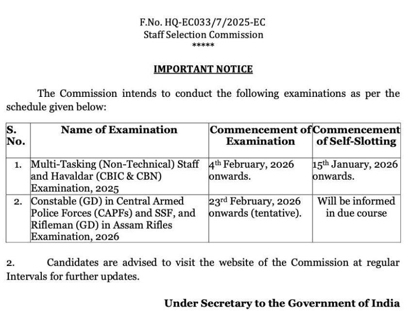 एजुकेशन डेस्क, नई दिल्ली। एसएससी की ओर से कॉन्स्टेबल जीडी भर्ती 2026 के लिए परीक्षा की शुरुआत 23 फरवरी से होनी है। लेकिन अभी तक स्टाफ सिलेक्शन कमीशन की ओर से इस भर्ती के लिए सेल्फ स्लॉट बुकिंग प्रक्रिया स्टार्ट नहीं की गई है। इसके अलावा अभी तक न ही सिटी इंटीमेशन स्लिप और न ही एडमिट कार्ड जारी किये गए हैं। ऐसे में उम्मीद है कि एसएससी की ओर से इस भर्ती की परीक्षा में बदलाव किया जाएगा। हालांकि, SSC द्वारा अभी तक इस बारे में कोई भी डिटेल साझा नहीं की गई है।