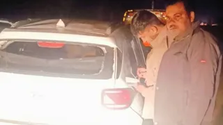 यमुना एक्सप्रेसवेे पर क्षतिग्रस्त कार की जांच करते पुलिसकर्मी।